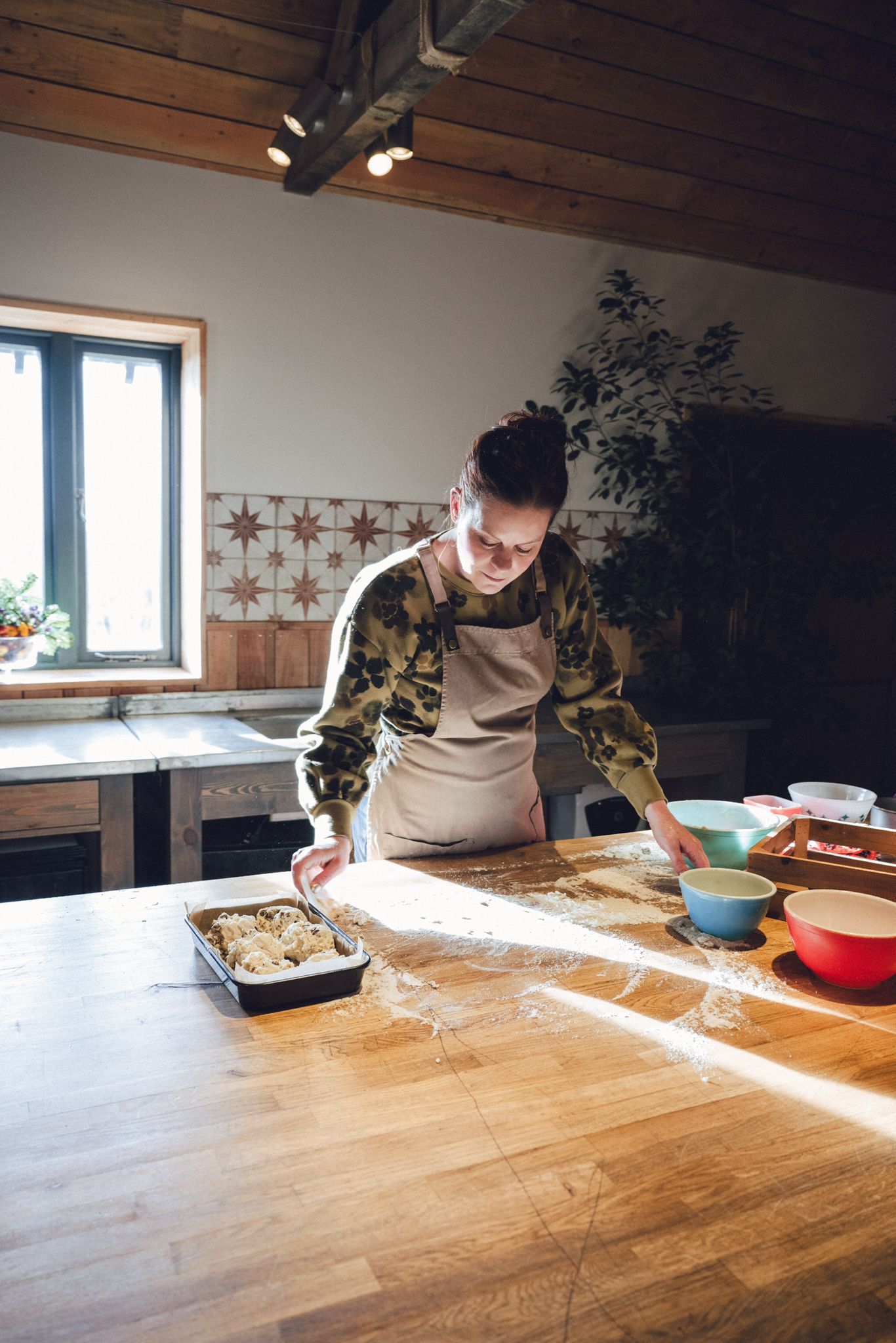 Turn your dough out onto a floured surface and form into a rectangle, about the size of your pan. Take your filling from the fridge and sprinkle in small lumps all over your rectangle of dough, leaving a gap of about 3cm at the long edge furthest from you. Roll the dough, like a jelly roll, away from you, until you have formed a long log of dough. Cut the log into 12 even pieces (or 6 if making a half recipe like the video). Place the rolls evenly in the pan. Do not worry if they look a bit messy, as they will all bake together beautifully!
